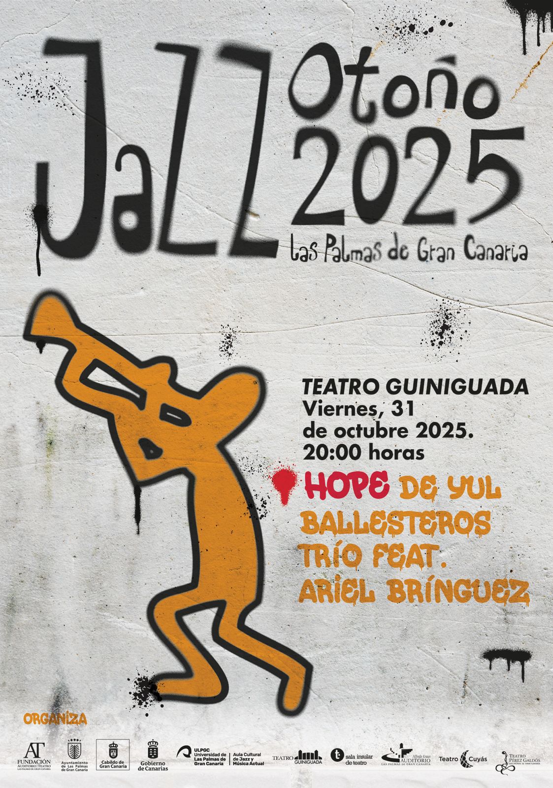 JAZZ OTOÑO 2025. «Hope de Yul Ballesteros». Taetro Guniguada 31.10.2025 octubre 11, 2025 por Agusanta Agustín Santana Correa, 11.10.2025Nuevo acontecimiento musical.HOPE DE YUL BALLESTEROSYa está en todas las plataformas el primer single del nuevo disco. El tema se llama Hope y es el que da nombre al CD.Qué maravilla contar con Ariel Brínguez, Akior García y Tana Santana. Espero que lo disfruten.