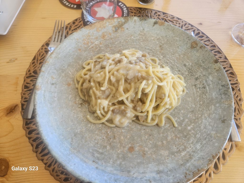 Spagettoni Porcini, sencillamente fantástico, cocinado dentro de un horma gigante de queso flameada con vino más el toque cremoso de los hongos porcini.