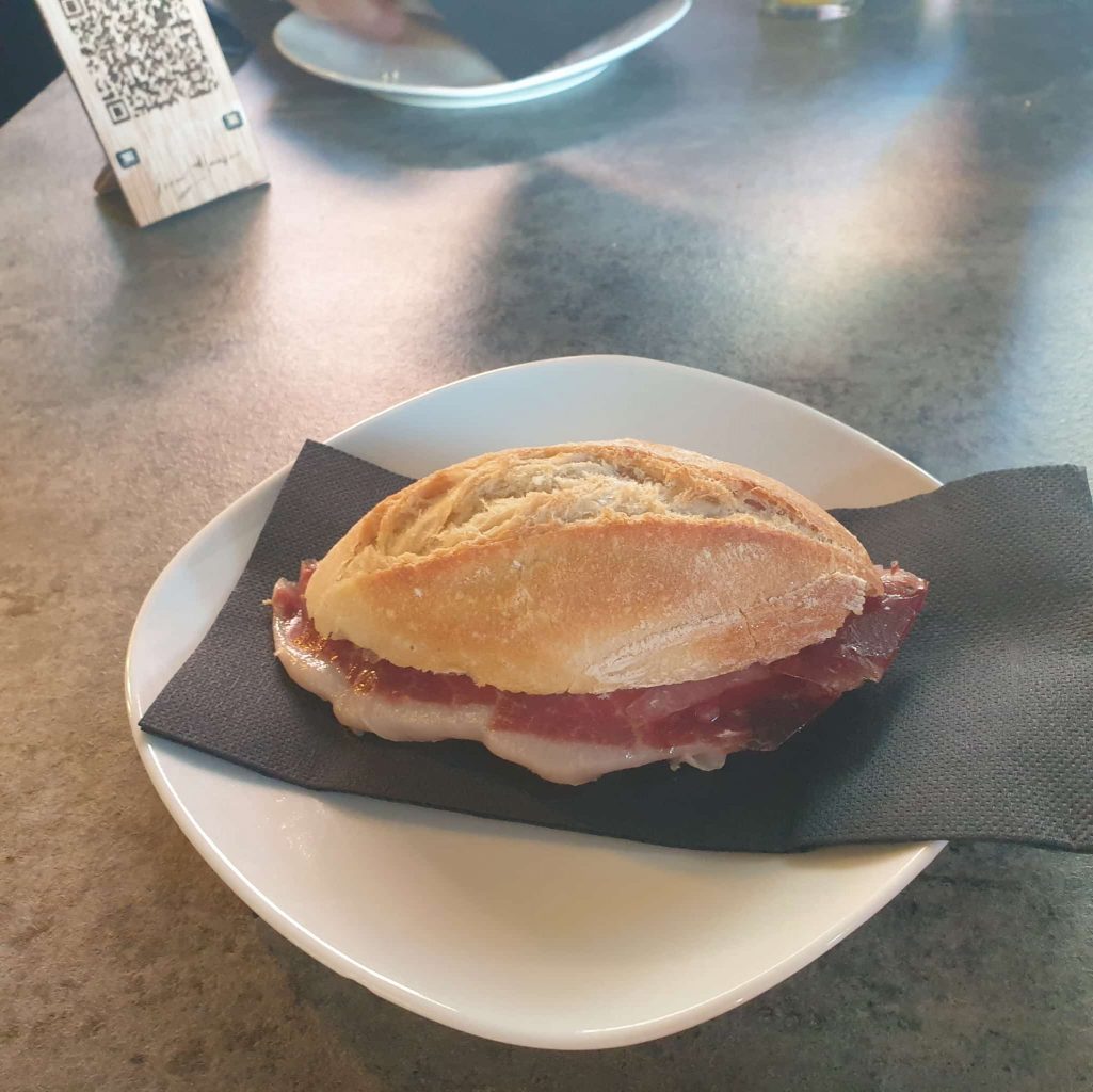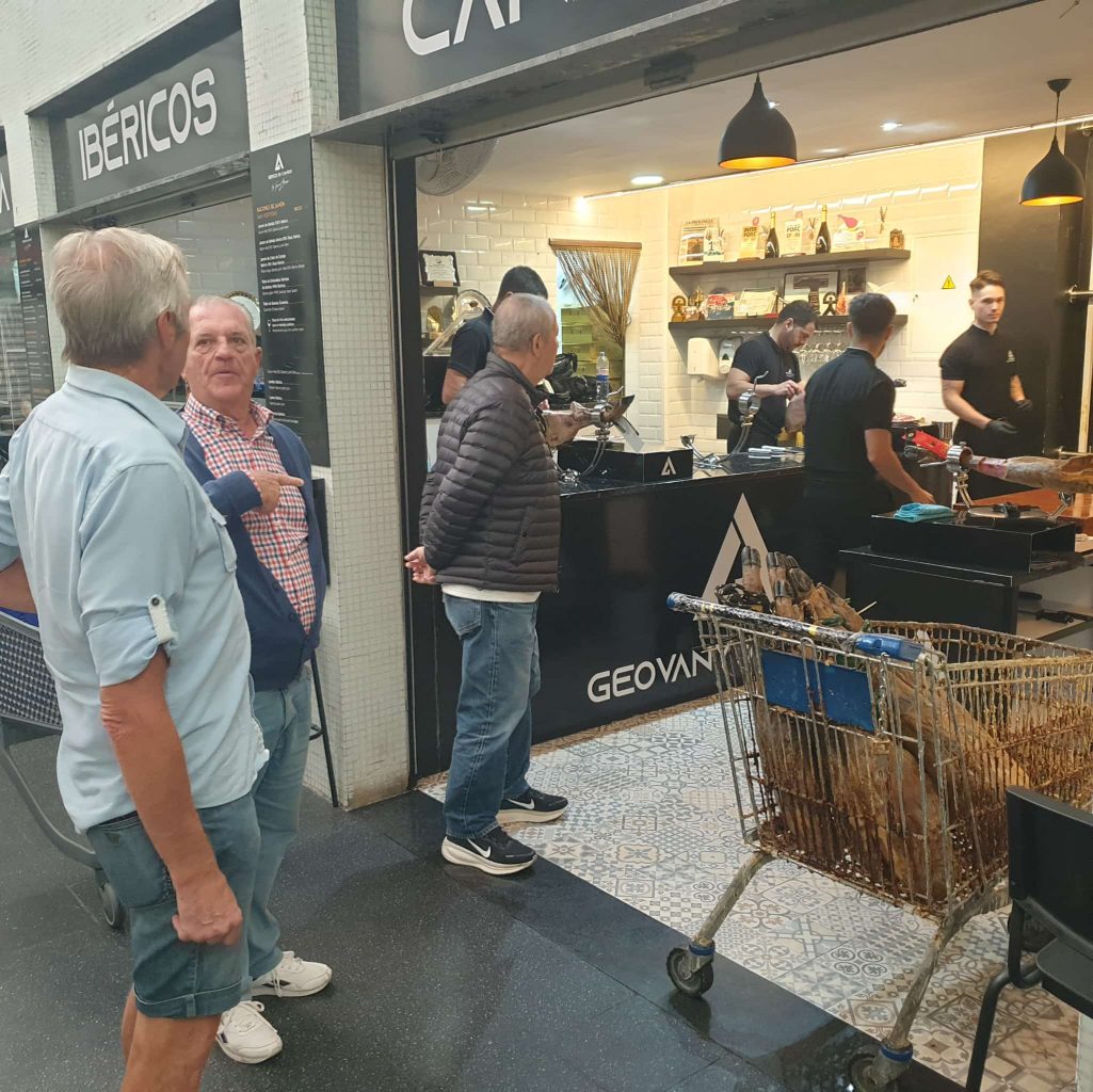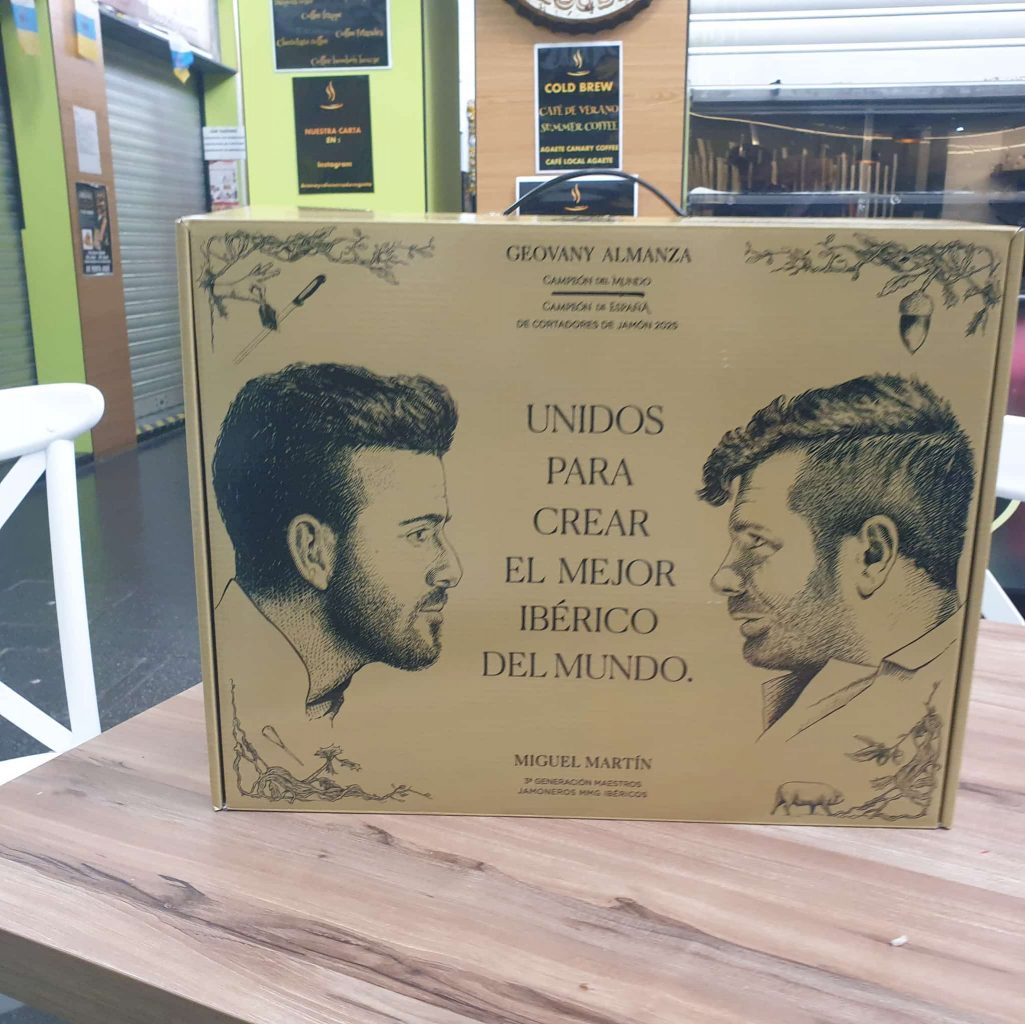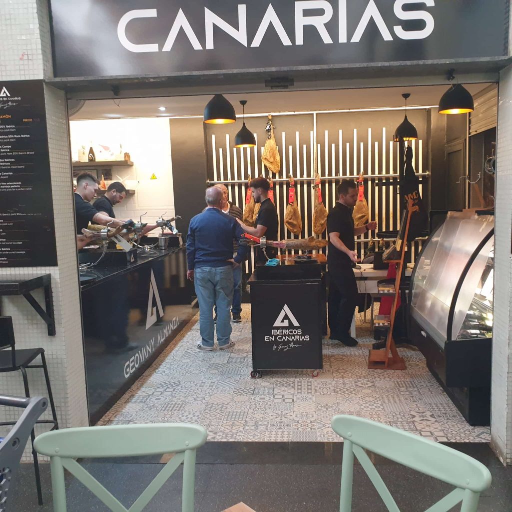 Comenzamos en Las Palmas en Ham Boutique, justo enfrente del parking del Mercado de Vegueta donde te espera, para la hora temprana del desayuno, un bocadillo de jamón 100% ibérico cortado a mano que es una verdadera delicia, acompañado además de un buen café, para después pasar por la tienda de Geovany Almanza, Campeón del Mundo y Campeón de España Cortador de Jamón a Mano 2025, en el mismo Mercado, donde tres cortadores a mano del jamón se esmeran en terminar las patas que lucen las pestañas negras.