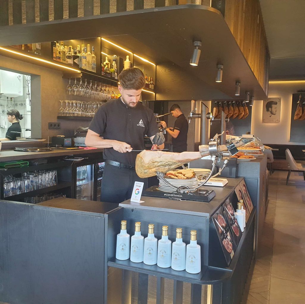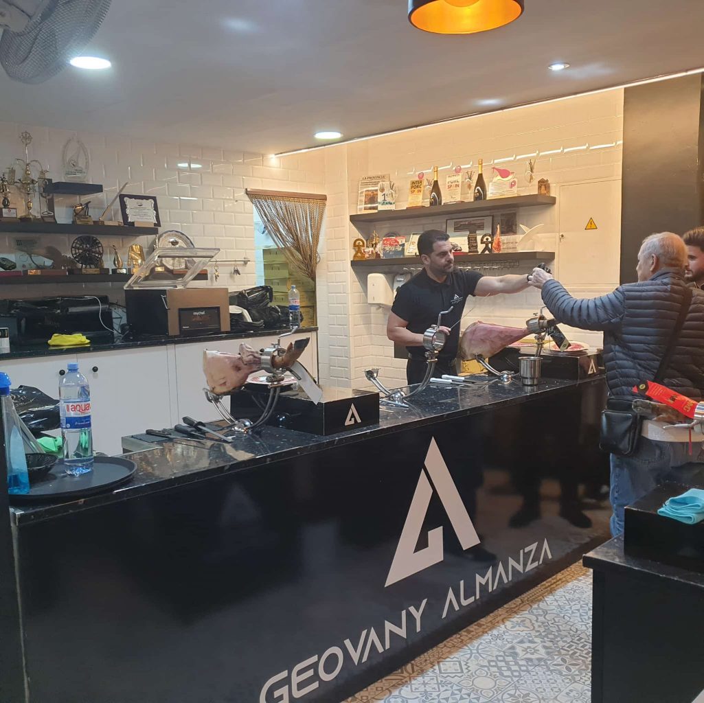 JAMÓN IBÉRICO 100% en Ham Botique Restaurant y en la Tienda de Geovany Almanza, Campeón del Mundo y Campeón de España 2025 de Cortador de Jamón.